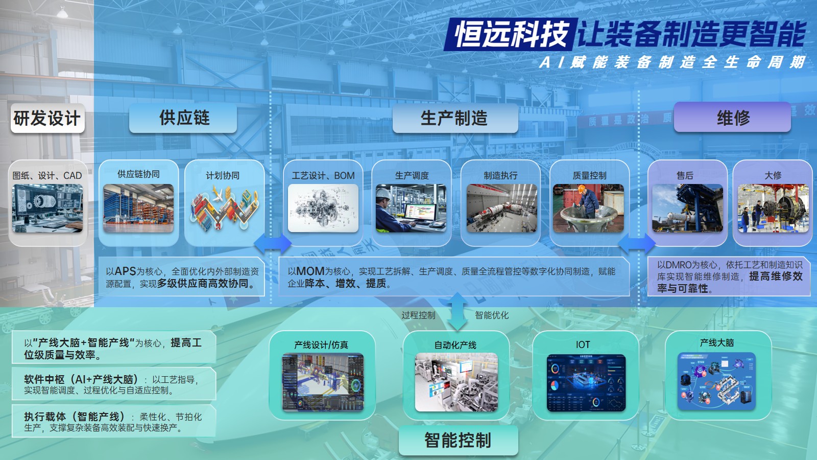 基于智能制造核心能力,恒远科技横向延伸打造装备全生命周期总集服务,构建产业链数字化协同平台与覆盖设备大修维护的全维运维保障体系,形成贯穿研发设计、供应链协同、生产制造到售后维修的完整价值链。