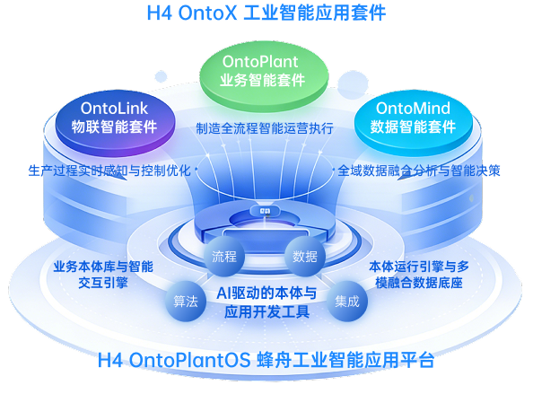 基于工业大模型引擎,形成本体元模型驱动的数据应用智能(OntoMind)、业务执行智能(OntoPlant)、设备连接智能(OntoLink)和边缘决策智能(产线大脑)等AI新范式产品矩阵,实现从数据采集、边缘计算、协同制造、智能决策的全链路贯通,打造“活态自主、自驱演进”的新一代智能制造系统,加速企业数智化高质量发展。