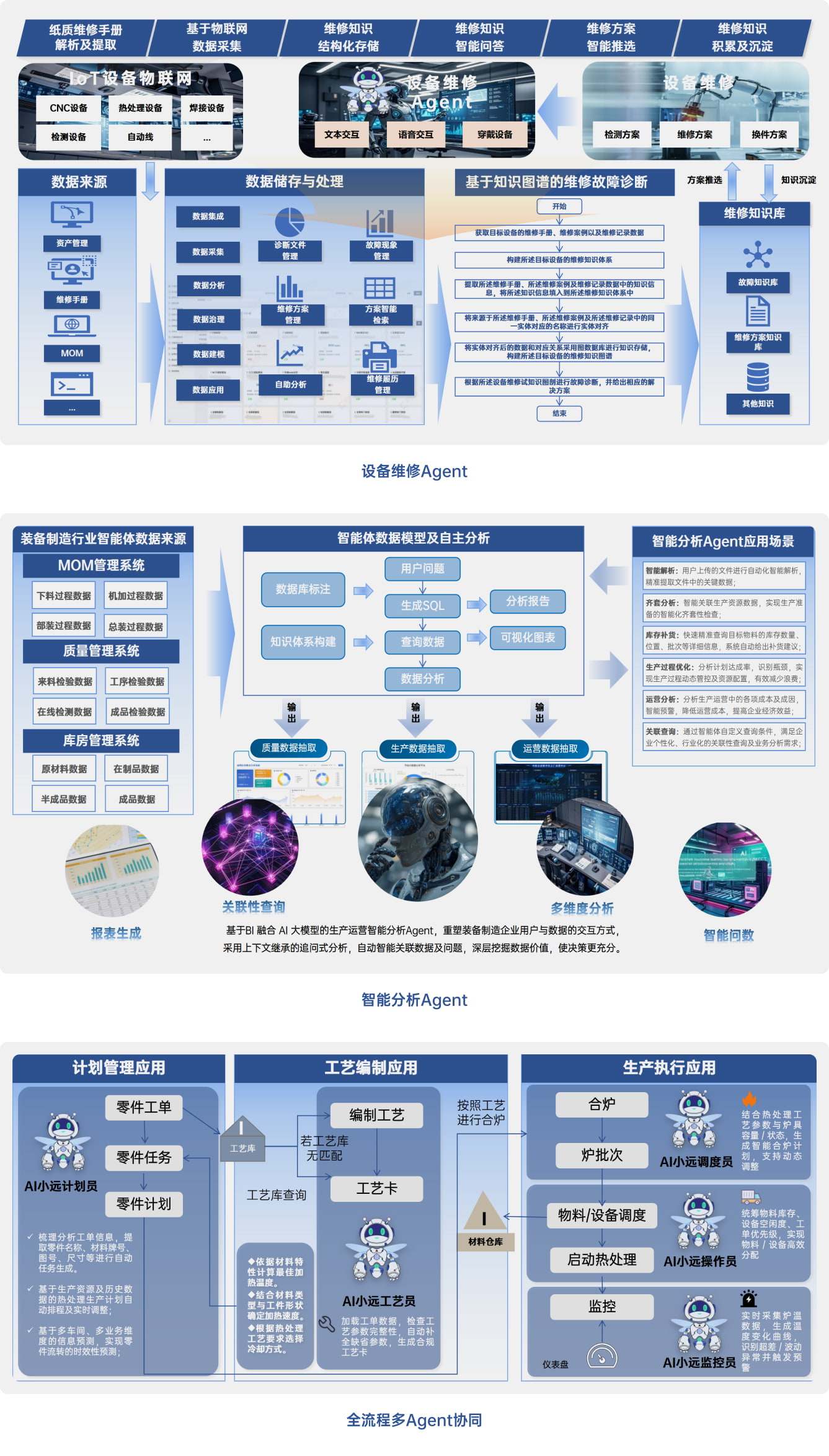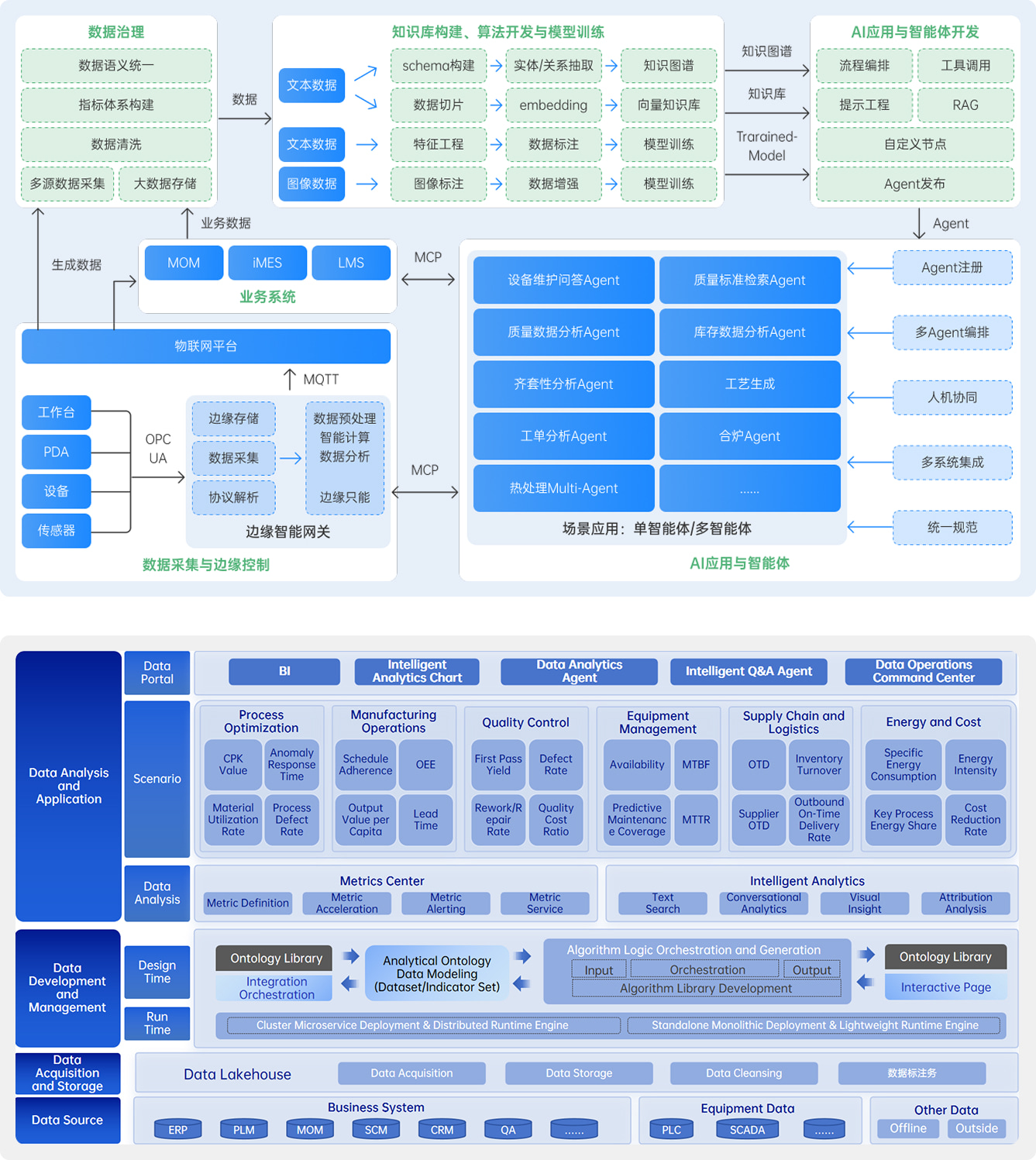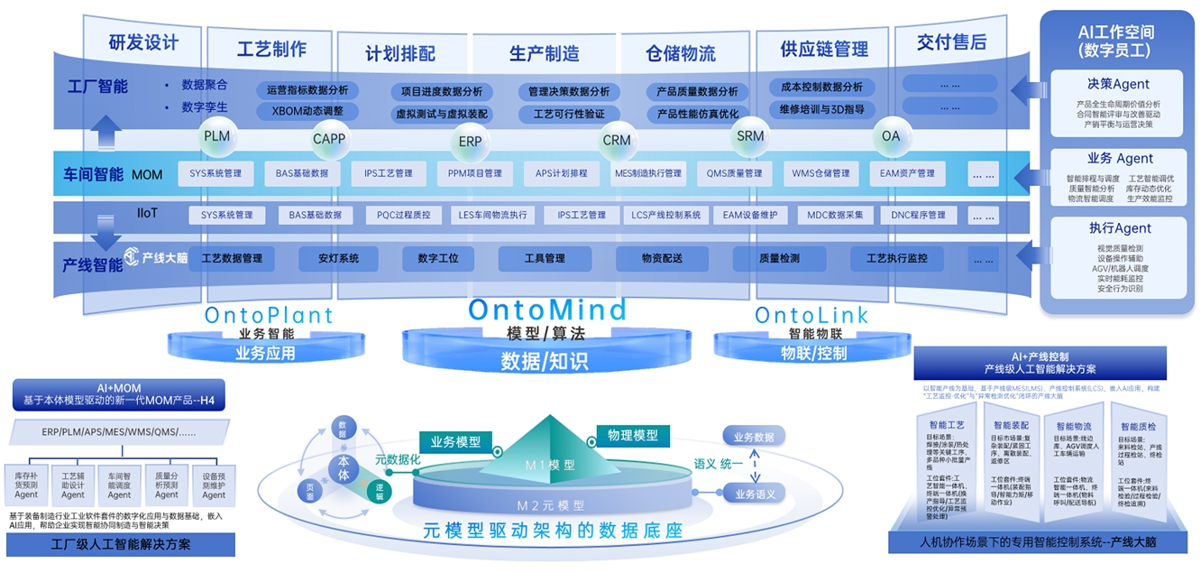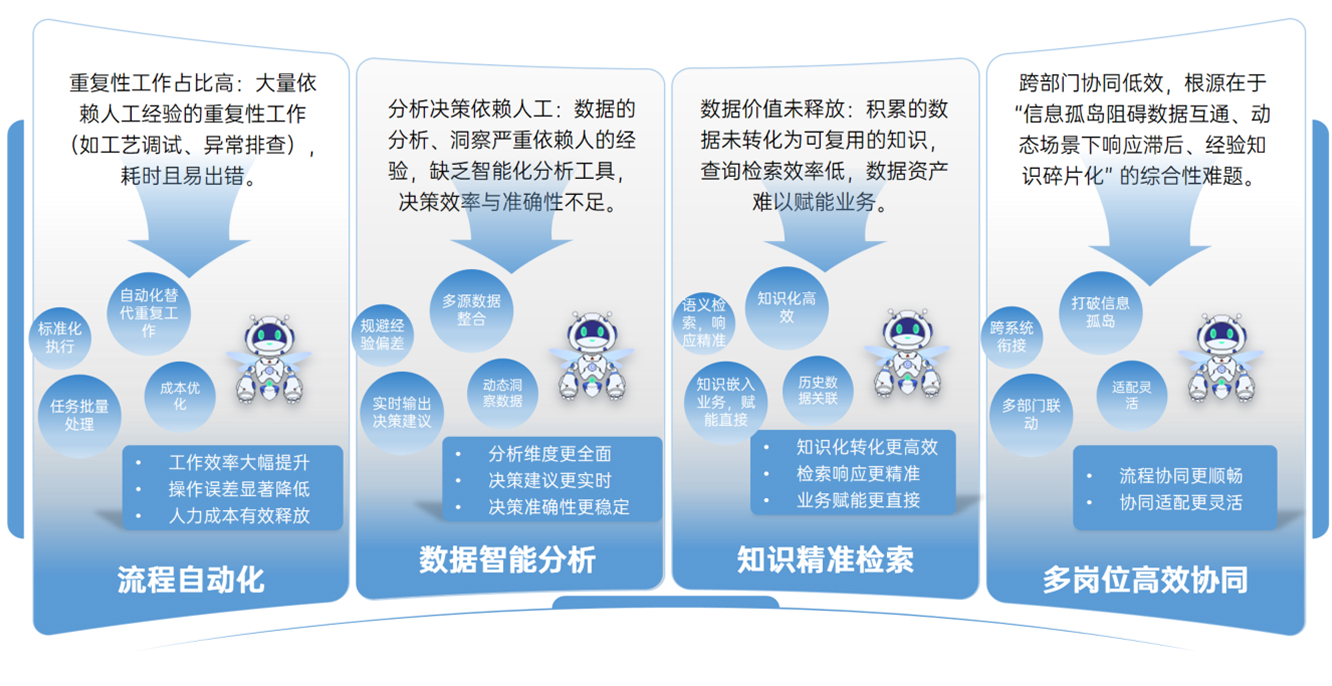 Relying on meta-models and a robust data foundation, we deeply integrate AI foundation models. By providing precise knowledge retrieval, intelligent analysis, and multi-scenario Agent construction capabilities, we enable workflow automation and highly efficient cross-role collaboration, comprehensively driving the digital and intelligent upgrade of the entire equipment manufacturing process.